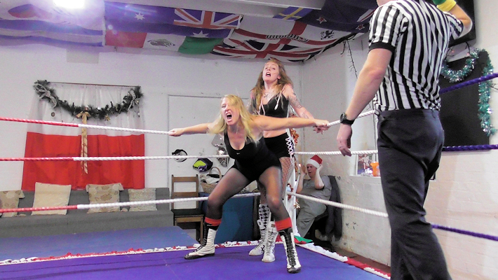 "Simply the Best" - Pippa teams up with Eva for this tag match; both attired in green and red festive