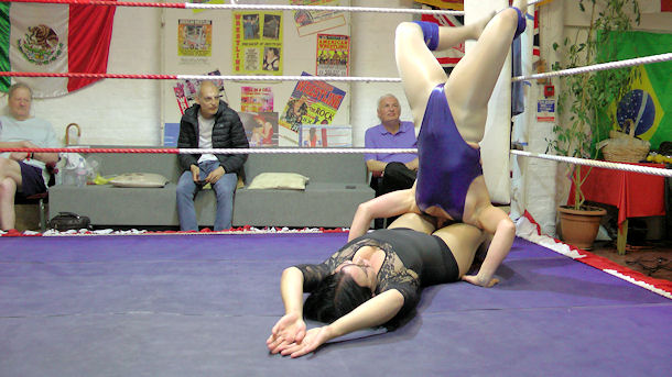experience allows her to adapt pro. wrestling techniques in this mat based bout.
