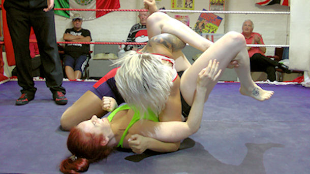 Shelby takes charge early on with a series of armbars and wristlocks; successfully thwarted by the blonde superhero rival.