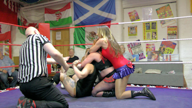 Then, with Lisa tied up in the ropes, Bunny and Violet go at each other in an attempt to get the vital pin.