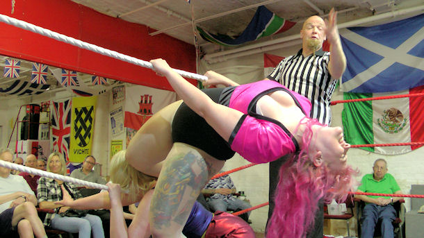 Both wrestlers clamped each other defiantly with their legs as Jenny attempted to belittle her